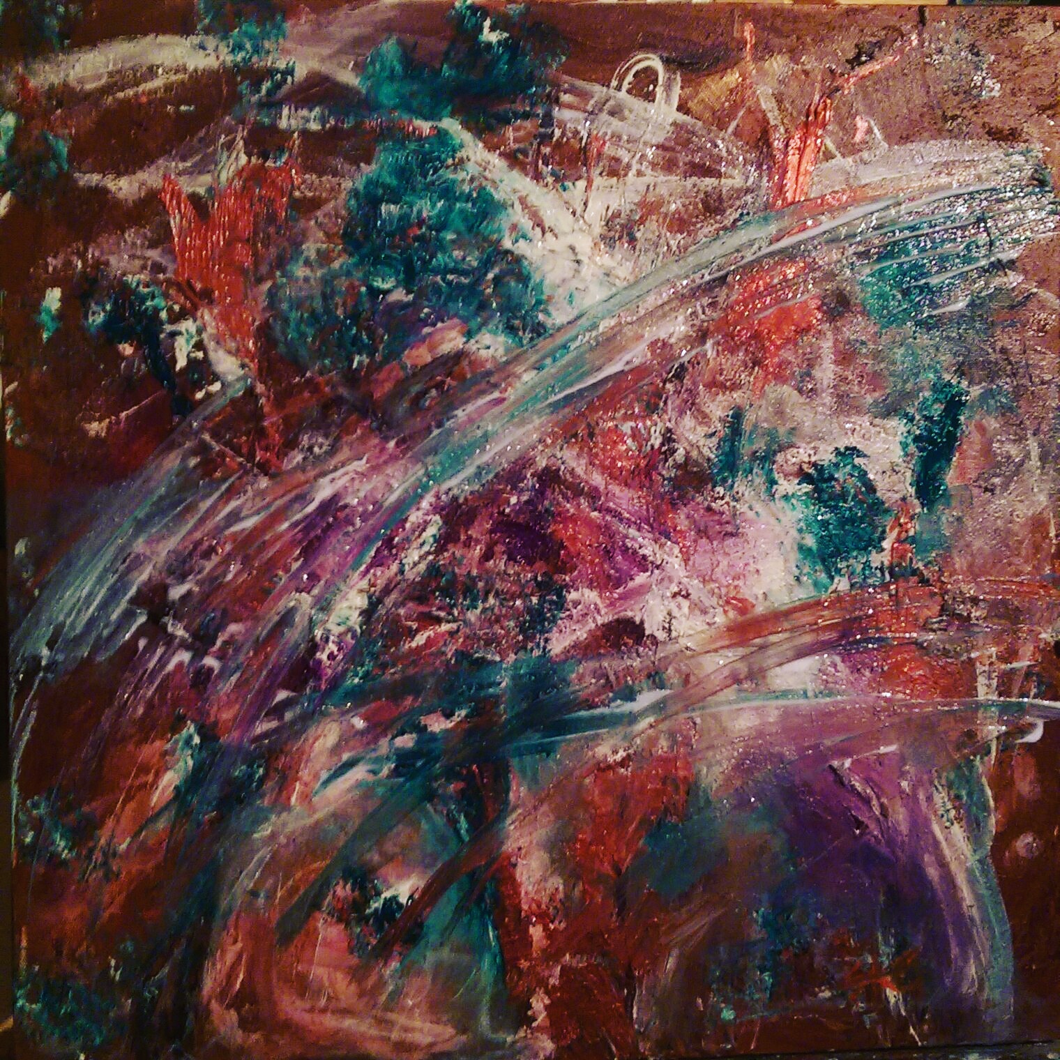 This is an 11”x14”x1”, acrylic on canvas. Its titled Landscapes of the Mind 2 and I don’t know what it reminds me of. Its so red and I don’t know where all this red is coming from. Generally, I am drawn to blues and greens…. Nonetheless, hope this one gets shown too!