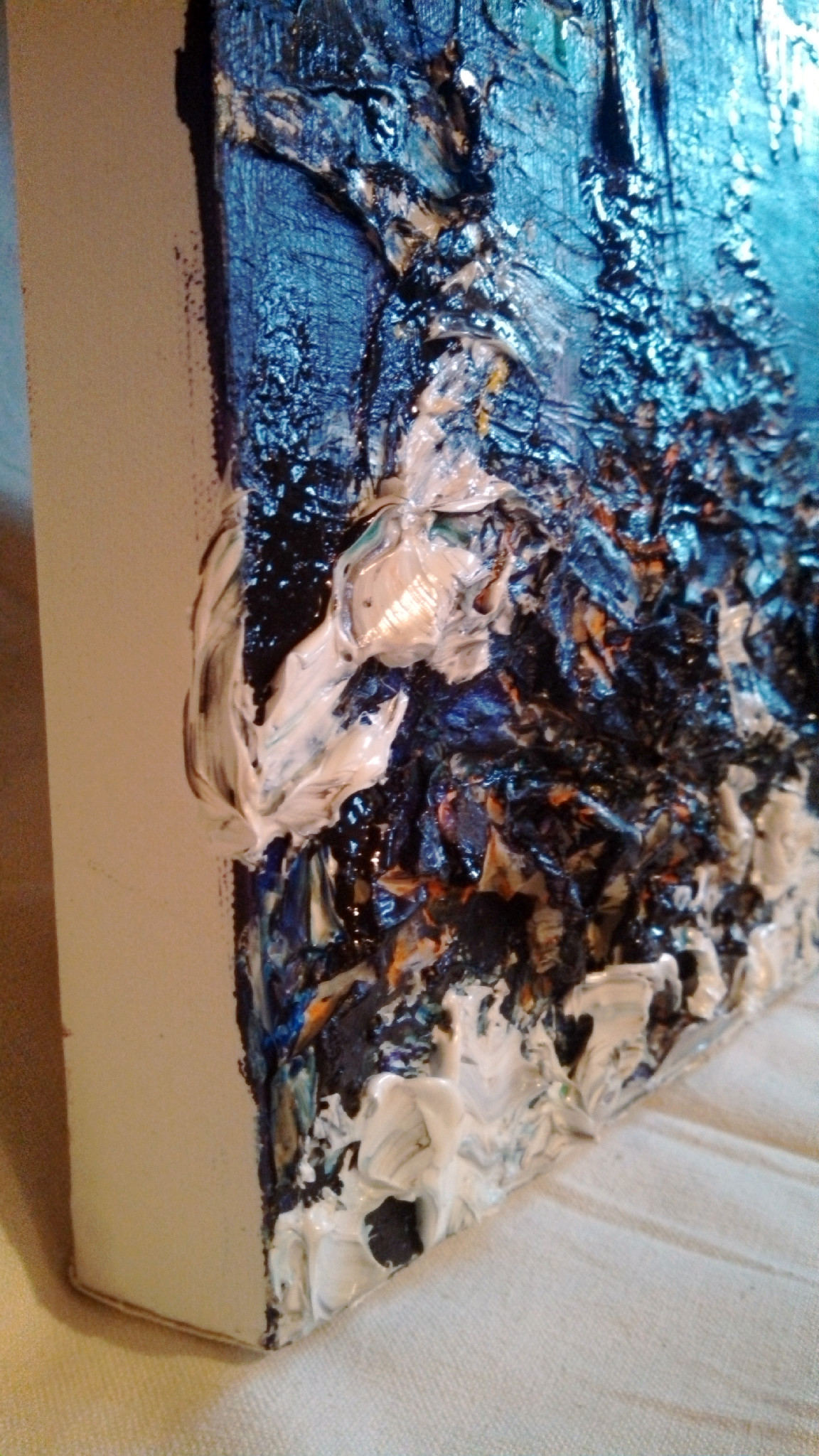 The bottom of the painting is layered in modeling paste, paint, and canary paper. It was a gentle and tedious task building this edge up and applying layer without smoothing the texture. The result is quite striking in the flesh.